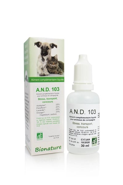 El producto A.N.D 103 es un extracto herbal con certificado de agricultura biológica a base de plantas y además oligoelementos. Por ello se trata de un gran producto calmante para viajes en coche, mudanzas, tormentas y demás situaciones que causan estrés y ansiedad a muchos perros y gatos.