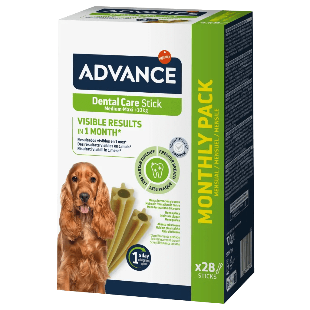 ADVANCE Dental Care contiene una fórmula exclusiva, con un triple efecto para el cuidado dental de tu perro medium / maxi, con resultados demostrados clínicamente: en 1 mes*, el 94% de los perros reducen la formación de sarro, 82% de los perros reducen la acumulación de placa, y el 65% de los perros tienen un aliento más fresco.El stick, adaptado al perro medium / maxi, tiene una forma especial que ayuda a eliminar los residuos de comida de los dientes de tu perro.* Estudio científico. Aliento más fresco: menor cantidad de compuestos volátiles de sulfuro comparado con los mismos perros que no comieron Advance Dog Dental Care Stick.