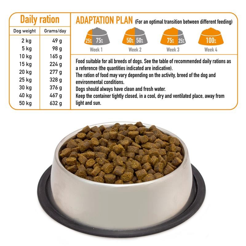 Dosificación: Consulte la tabla de cantidades diarias recomendadas (las cantidades indicadas son orientativas). La cantidad de alimento puede variar en función de la actividad, raza del perro y condiciones medioambientales. Los perros deben disponer siempre de agua limpia y fresca. Mantener el envase bien cerrado, en un lugar fresco, seco y ventilado, lejos de la luz y el sol.