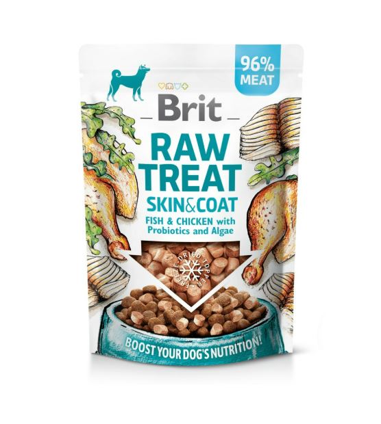 Brit Care Raw Treat Skin Coat Pescado Pollo. Snack liofilizado para perros. Alimento complementario con algas y probióticos para la salud del pelo y la piel. RAW TREAT liofilizado está pensado como complemento dietético y no debe sustituir una dieta completa y equilibrada.