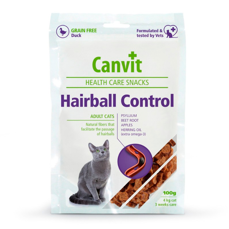 Canvit Hairball Control gatos. Snack funcional sin cereales para gatos. Previene la formación de bolas de pelo. Elaborado con pato, aceite de arenque, fibra de manzana y remolacha y psyllium.