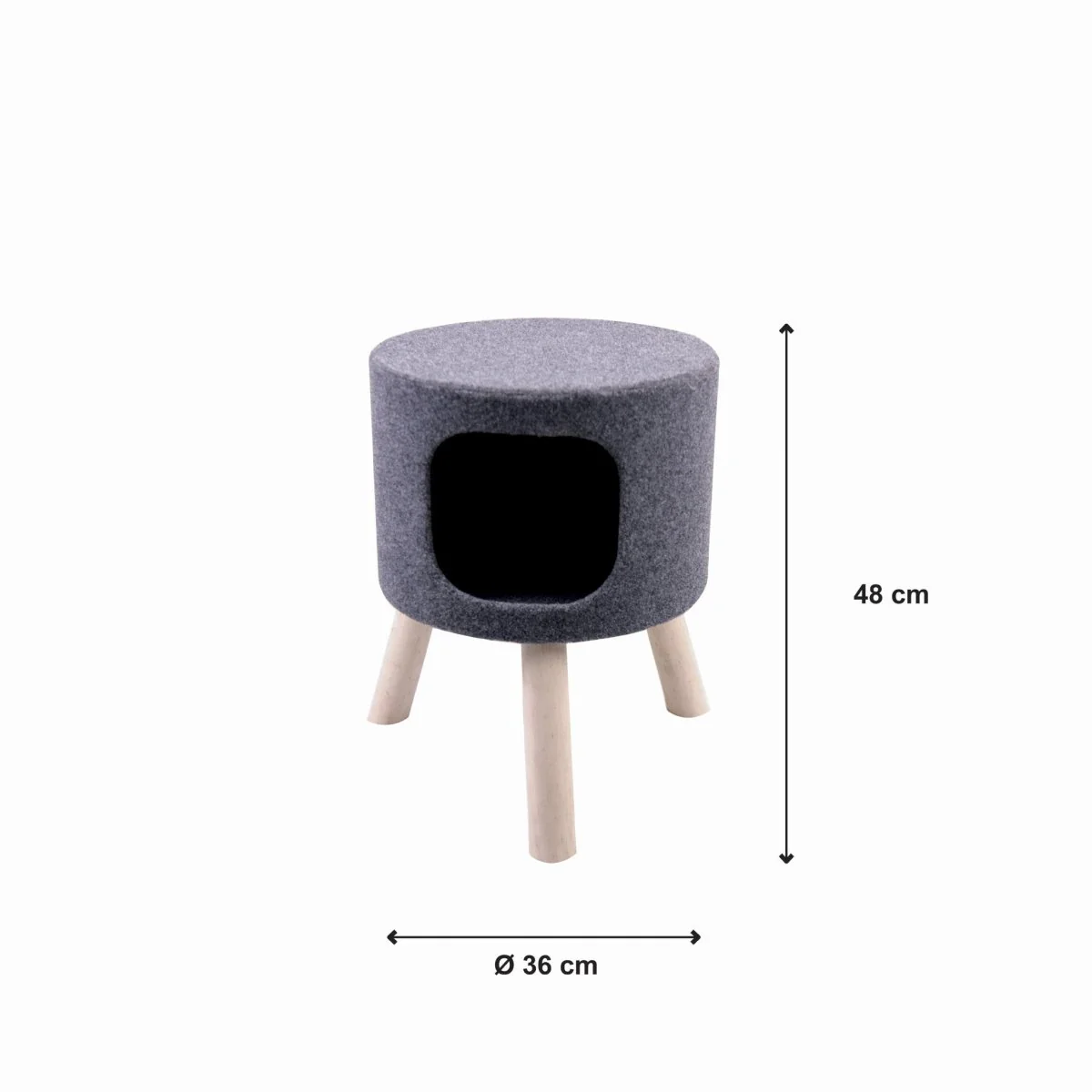 Debido al hecho de que la casa está montada sobre patas, puede aspirar fácilmente el piso debajo de ella. También es un área de descanso adicional para el gato, tanto debajo como encima de la casa. ¡A los gatos les encantan los lugares como este! El producto tiene las siguientes dimensiones: diámetro 36 cm, altura 48 cm. Hecho de materiales naturales, madera y fieltro, no solo es ecológico, sino que también hace que la casa se vea genial en cualquier interior.