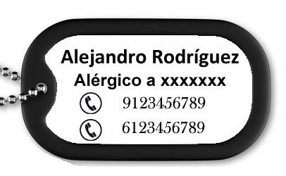 Colgante que identifica que la persona es alérgica e indica su nombre, alergia y hasta 2 números de teléfonos en caso de que exista alguna emergencia.