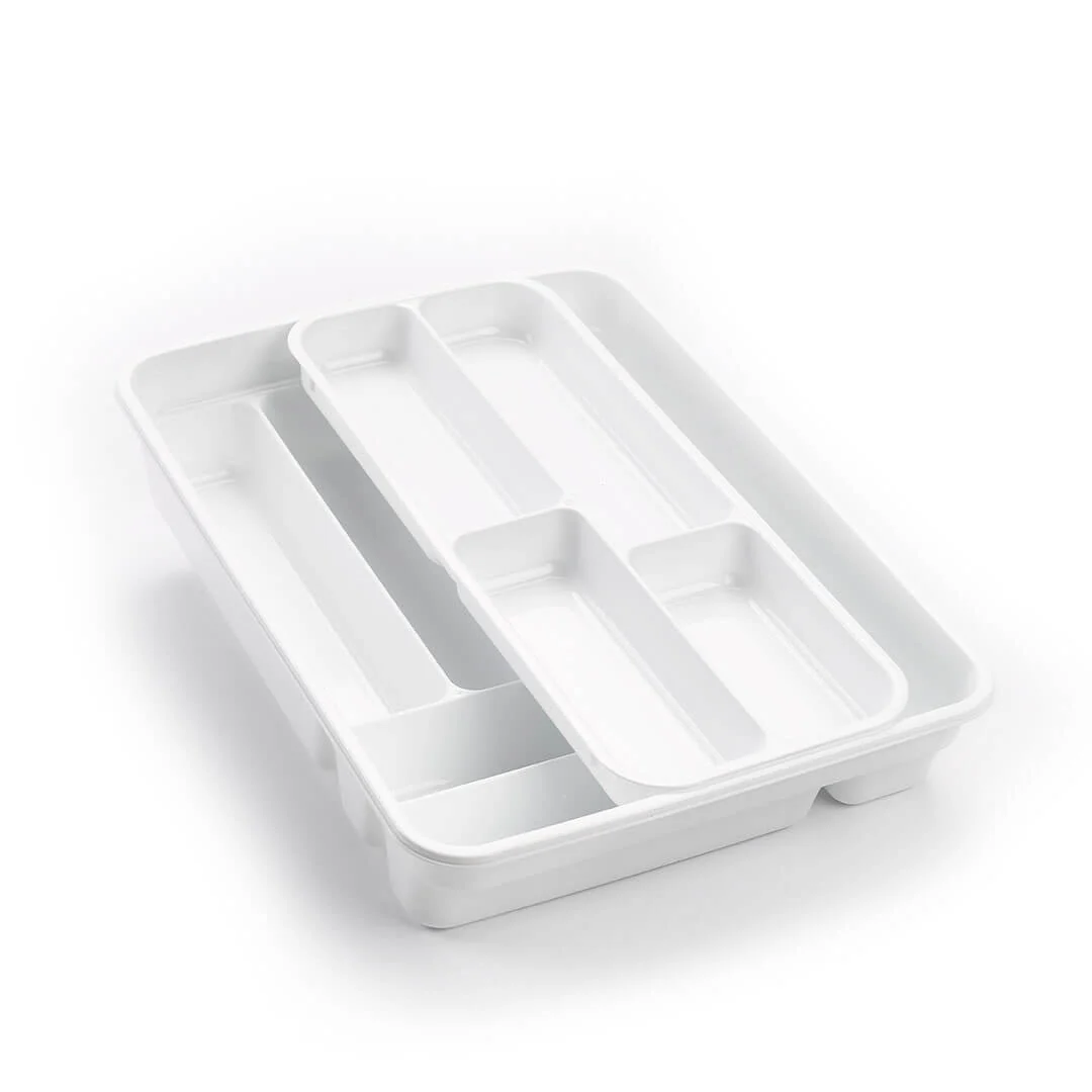 Dos piezas de bandejas para cubiertos, color plata para cajones y muebles de cocina. Este organizador de cajones es ideal para guardar con claridad los cubiertos, y aporta mayor comodidad con las dos piezas extraíbles.