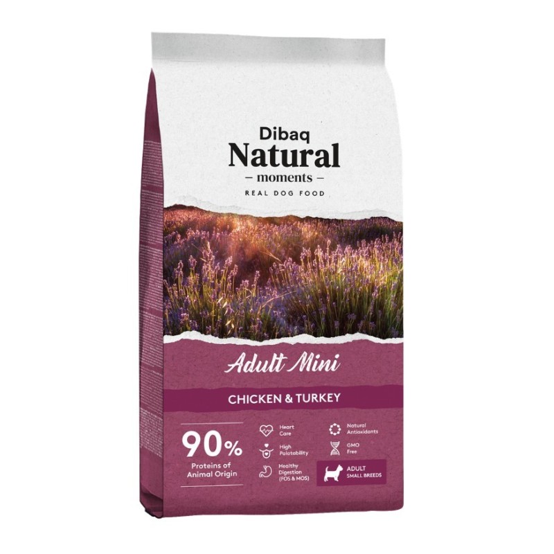 Dibaq Natural Moments Adult Mini es un pienso completo para perros adultos de razas pequeñas, elaborado a base de un 90% de proteina de origen animal.