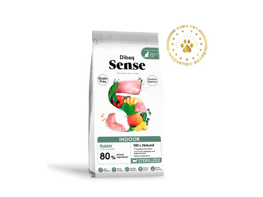 Dibaq Sense Cat Esterilizado Indoor Conejo. Alimento completo sin cereales para gatos adultos y gatos esterilizados que viven en interior. Elaborado con carnes frescas, frutas y verduras frescas y FOS y MOS.