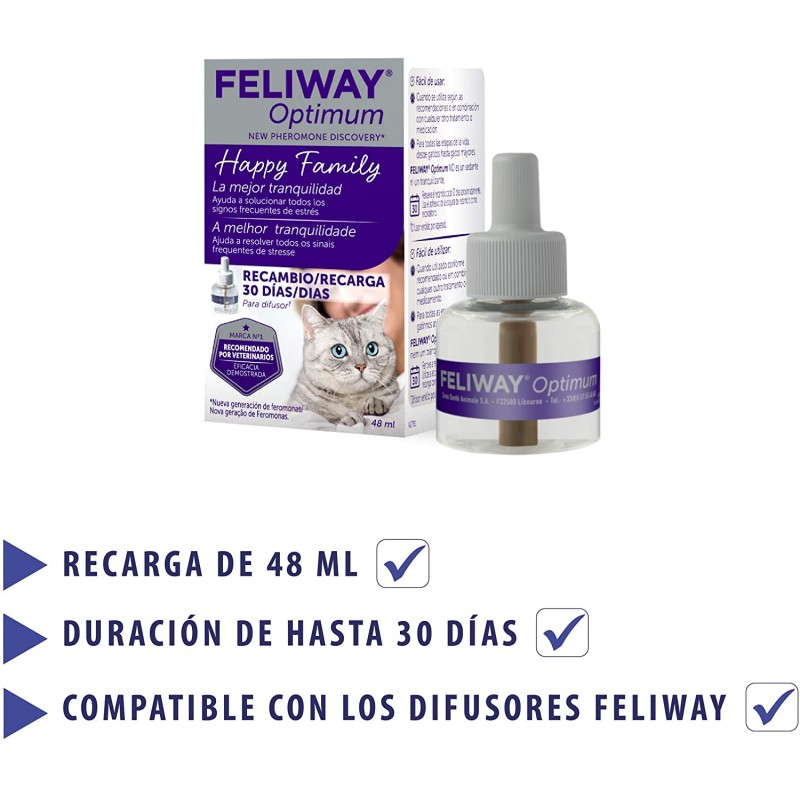 Feliway Optimum Recambio Difusor gatos. Feliway Optimum Recsmbio Difusor es apto para gatos de todas las edades y todas las razas. Feliway Optimum crea un entorno de bienestar haciendo que el gato (o los gatos) se sientan cómodos y tranquilos. Ayuda a corregir o prevenir comportamientos inadecuados del gato como pueden ser arañazos en muebles, orina por la casa queriendo marcar territorio, miedos, o situaciones de nerviosismo al estar solo en casa. También ayuda, Feliway Difusor, a que los gatos se puedan adaptar a entornos o viviendas nuevas, obras, llegada de bebés o cambios de distribución en casa.