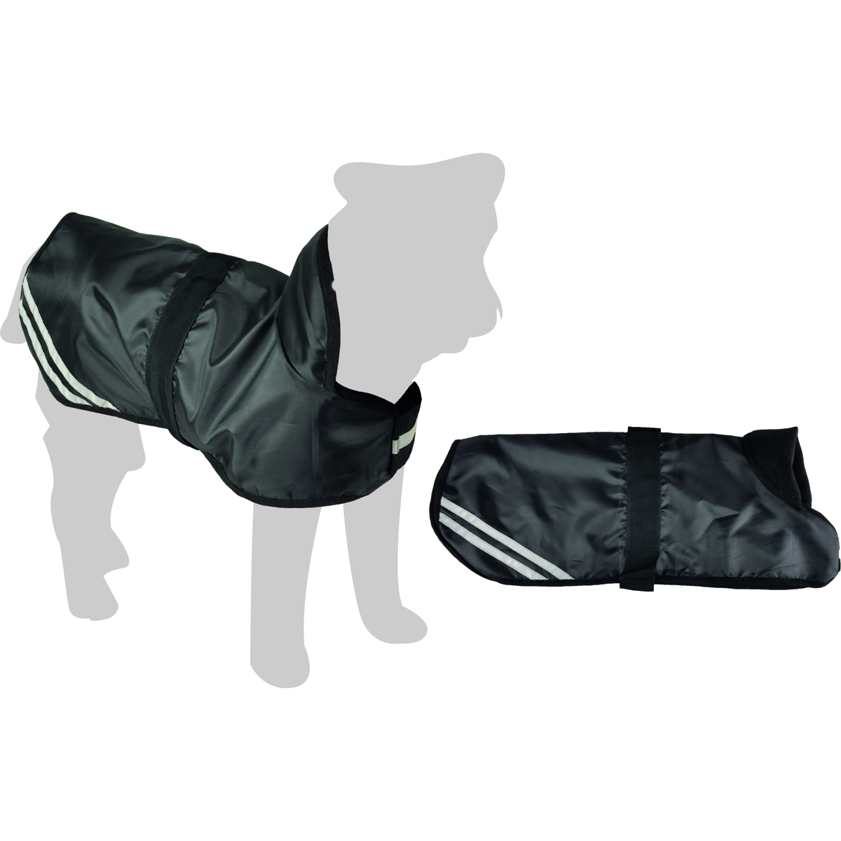 Chubasquero de nilón transpirable con interior de vellón. Resistente al agua y cortavientos. Lavable a 30°C. Correa con cierre de gancho y bucle y elásticos para las patas traseras. Acabado con un revestimiento de poliuretano (PU) y tiras reflectantes. Con abertura para la correa y cuello alto para una mejor protección