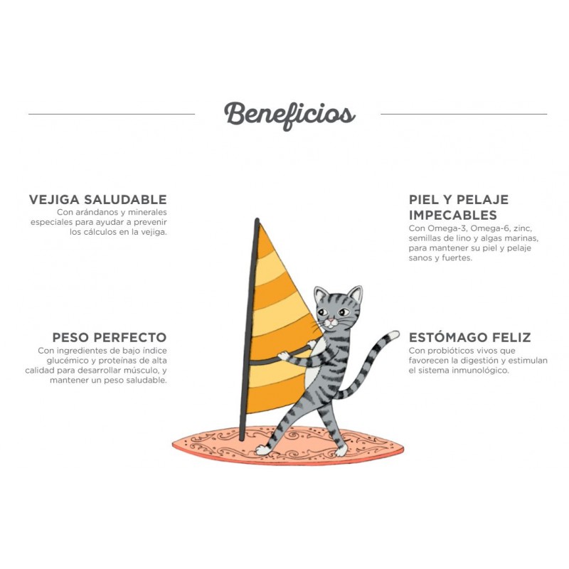 Harper And Bone Esterilizado Ocean Wonders. Pienso seco bajo en cereales para gatos adultos esterilizados compuesto de productos del mar, lo que supone un aporte proteico de atún, pescado blanco y salmón, además de verduras y frutas frescas. Se trata de un alimento que contiene taurina, además de probióticos, que resulta ideal para el mantenimiento de unos huesos y unos dientes fuertes. Receta con L-carnitina ideal para el control del peso y el cuidado del sistema urinario. Contiene EPA y DHA, que contribuyen al desarrollo del cerebro y la visión.