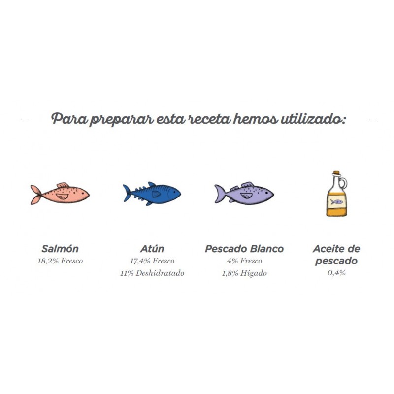 Composición: Salmón preparado en fresco 18,2%, atún preparado en fresco 17,4%, guisantes verdes enteros, atún deshidratado 11%, proteína de patata, proteína de arroz, cebada integral 4,4%, pescado blanco preparado en fresco 4%, fibra de manzana, avena integral 3,5%, hidrolizado de pescado 1,8%, patata dulce deshidratada 1,6%, semillas de lino (fuente natural de ácidos grasos ω3) 1,5%, proteína de guisantes, pulpa de remolacha, arroz integral 0,5%, levaduras (Saccharomyces cerevisiae), aceite de pescado (protegido con tocoferoles naturales) 0,4%, minerales, brócoli fresco 1000 mg/kg, calabaza fresca 1000 mg/kg, zanahorias frescas 1000 mg/kg, manzanas frescas 1000 mg/kg, pared celular hidrolizada de levaduras (fuente de MOS) 1000 mg/kg, achicoria (fuente de FOS) 1000 mg/kg, glucosamina 500 mg/kg, extracto de mandarina 500 mg/ kg, condroitina 300 mg/kg, Yucca schidigera 200 mg/kg, alga kelp 30 mg/kg, arándanos rojos enteros 30 mg/kg, rosa canina (rica en vitamina C) 30 mg/kg, té verde 30 mg/kg, cúrcuma 30 mg/kg.