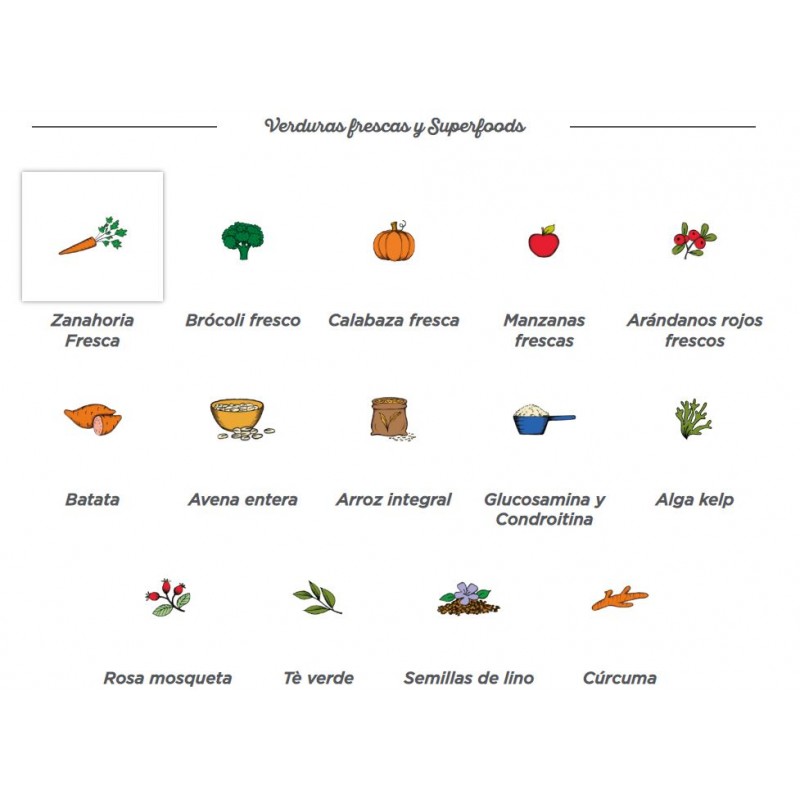 En la mezcla se incluyen algunos superalimentos que nos ofrece la naturaleza, así como probióticos saludables que favorecerán la digestión y estimulan el sistema inmunológico del cachorro. Contiene vitaminas y minerales esenciales, sino que además contiene condroitina y glucosamina para ayudar al buen estado de huesos y articulaciones, así como un aporte de Omega-3, Omega-6, zinc, semillas de lino y algas marinas, para mantener su piel y pelaje sanos y fuertes.