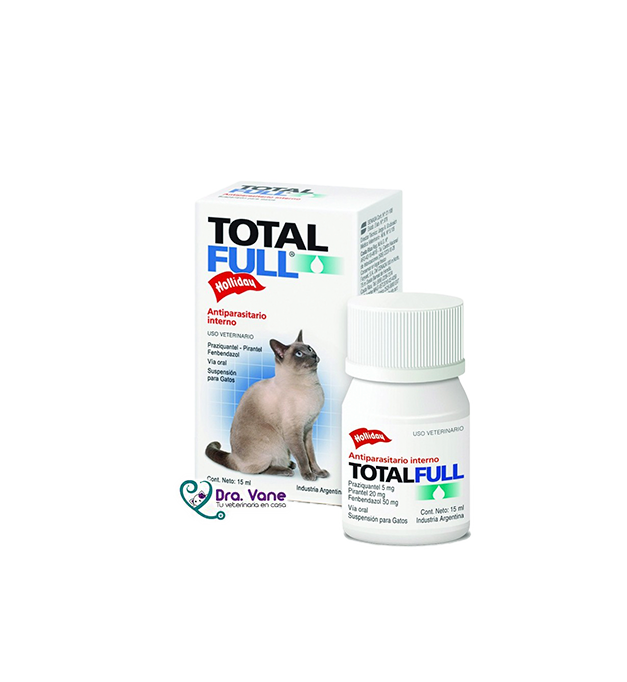 TOTAL FULL Suspensión gatos, es un antipasitario interno oral de amplio espectro que contiene Praziquantel, Pirantel y Fenbendazol. Es un producto que se indica tanto en infestaciones por cestodes (como Dipylidium caninum o Taenia sp.), nematodes (como Toxacara canis; Toxascaris leonina; Ancylostoma caninum y Trichuris vulpis) al igual que en las infestaciones causadas por protozoos (Giardia canis en sus formas quísticas).