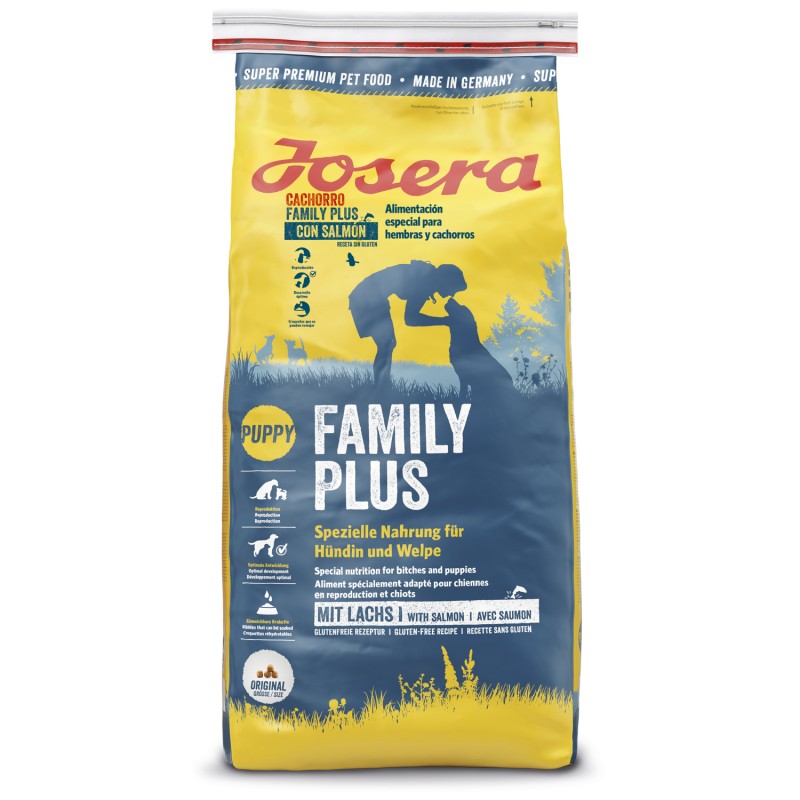 Josera Special Family Plus. Josera Senior Plus para cachorros y hembras en la etapa de lactancia. Pertenece a la gama de piensos secos Josera Special. Contiene salmón y altos niveles de proteínas y energía. Pienso sin gluten. Con taurina para la fertilidad y valiosos antioxidantes que activan el tejido metabólico durante las fases de alto rendimiento. Gracias al contenido de ácidos grasos de salmón, favorece el desarrollo cerebral de los cachorros.