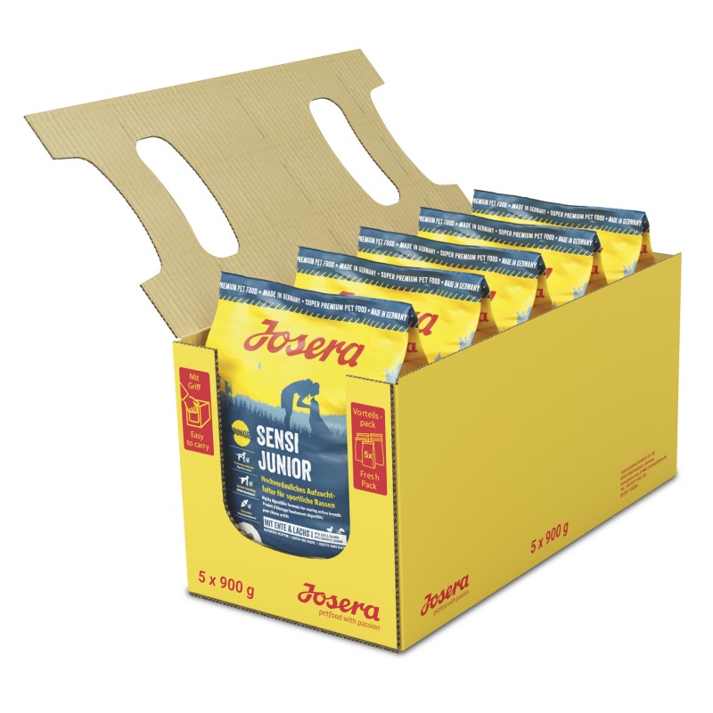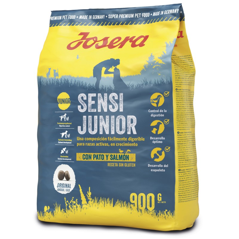 Josera Special Sensi Junior para cachorros. Josera Sensi Junior para perros de razas activas (grandes y medianas) y en crecimiento. Pertenece a la gama de piensos secos Josera Special. Contiene pato y salmón, siendo una receta muy digestible, perfecta también para perros sensibles, pues contribuye a disminuir la cantidad de heces gracias a su combinación de fibras. Pienso sin gluten. Además de ácidos grasos del salmón, que favorecen la el desarrollo cerebral y ayudan a desarrollar su aprendizaje. Alimentación fácil de digerir. Con L-carnitina y taurina, que favorecen el desarrollo de los huesos y las funciones cardiovasculares.
