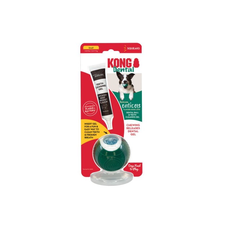 Kong Dental Ball Kit tiene dos cápsulas para llenar con gel dental con sabor a pechuga de res ahumada (incluido) que se libera dentro de la boca de los perros mientras mastican el juguete duradero, destruyendo el 99,9% de las bacterias. Mucho más divertido que cepillarse, masticar la pelota satisface los instintos naturales, mientras que las protuberancias elevadas ayudan a limpiar los dientes y las encías. Boquilla de tubo cónico para un llenado fácil y sin ensuciar.
