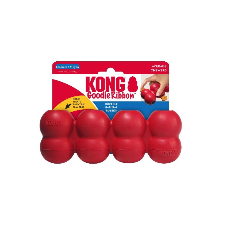 Kong Goodie Ribbon fabricado con la goma duradera especial de la marca Kong. Los cuatro espacios de Stuff KONG Goodie Ribbon hacen que sacar los premios sea un rompecabezas mentalmente desafiante para los perros. Satisface los instintos naturales de masticación y al mismo tiempo proporciona una solución duradera que mantiene a los perros entretenidos. Ideal para rellenar con KONG Easy Treat, KONG Snacks o la croqueta favorita de un perro.