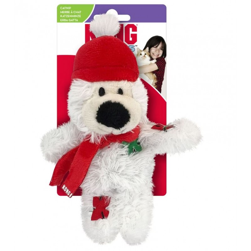 Kong Holiday Sofites Oso Peluche Gatos. Peluche navideño suave con catnip en el interior para estimular los instintos del gato. Fabricados con fibras de poliéster, PVC, catnip, cuentan con materiales resistentes y sonido crujiente, lo que aumenta las ganas de atraparlos. La forma curva y el cuerpo suave invitan a una lucha libre sana. Materiales suaves y resistentes. Perfecto para morder y lanzar. No desprende pigmentos ni residuos.