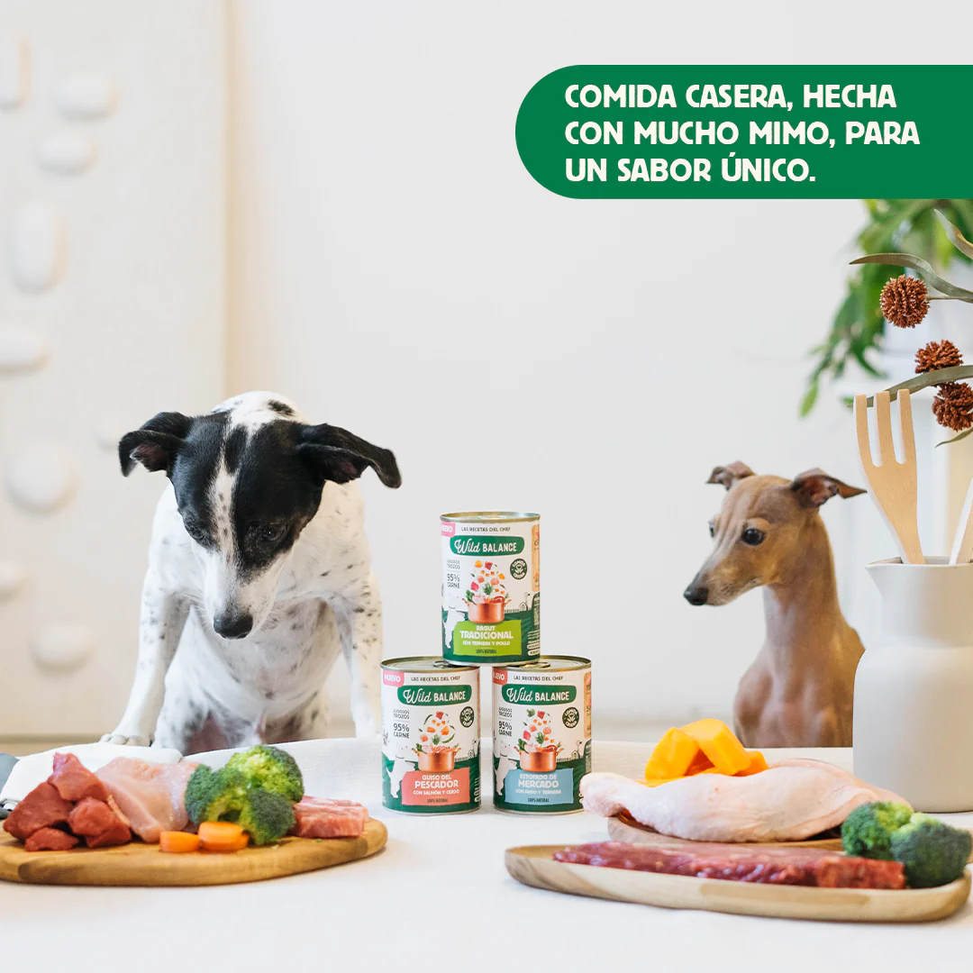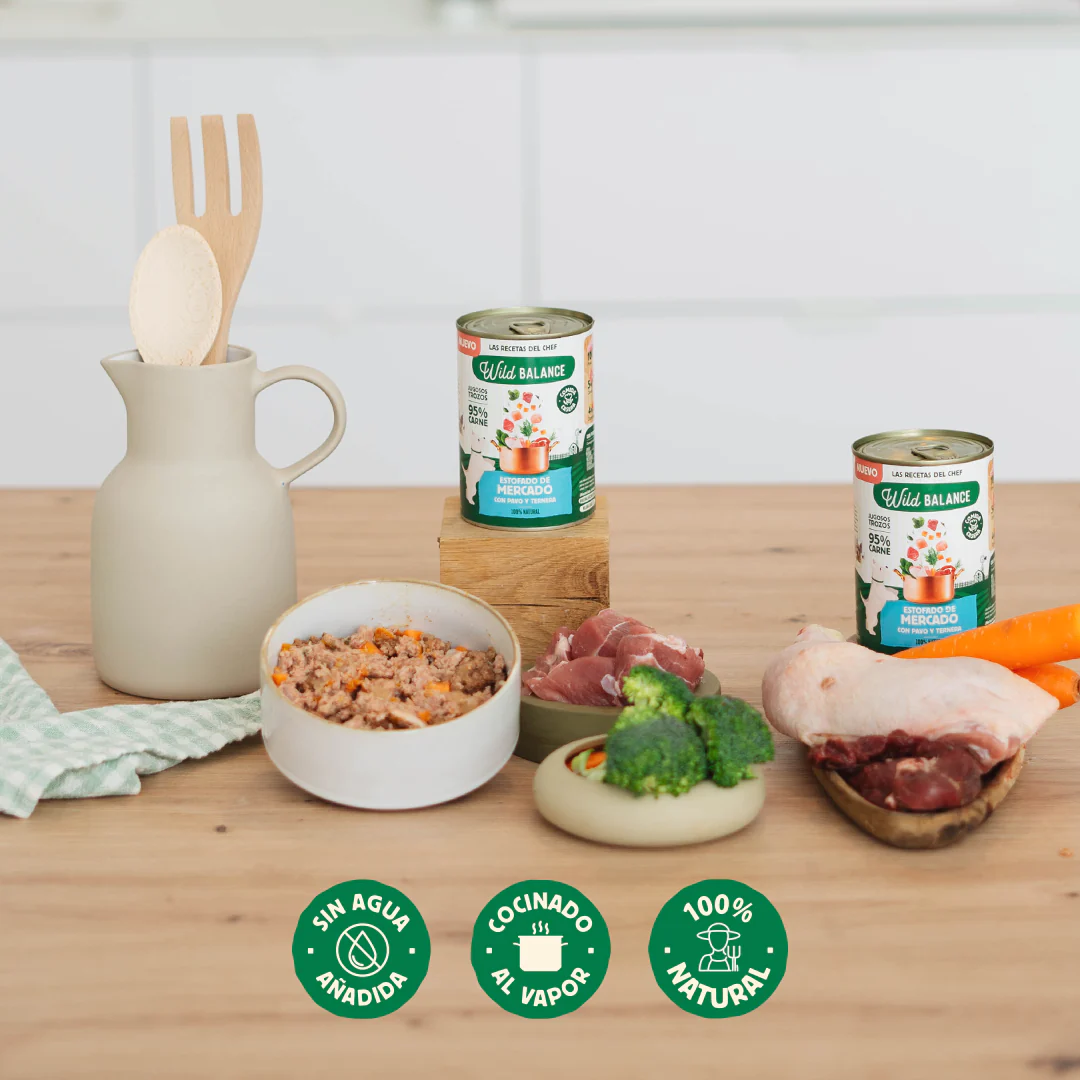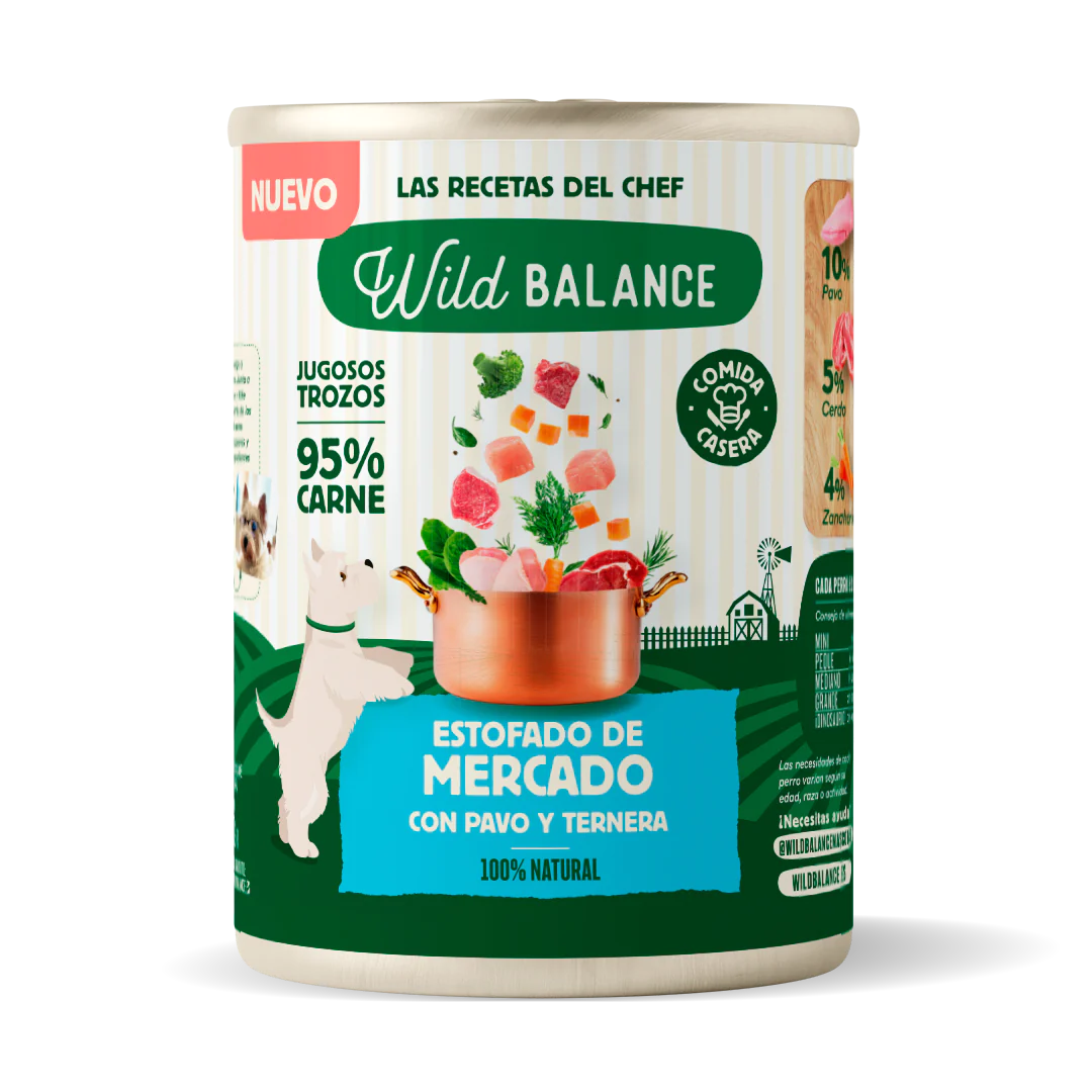 Somos conscientes de la importancia que tiene la alimentación para nuestros perros, por ello todas las latas de Wild Balance contienen ingredientes de calidad, con un alto porcentaje de carne y verduras (70% pollo, 10% pavo, 10% ternera, 5% cerdo, 4% zanahoria y 1% brócoli). Cocinados a fuego lento y con mucho amor.