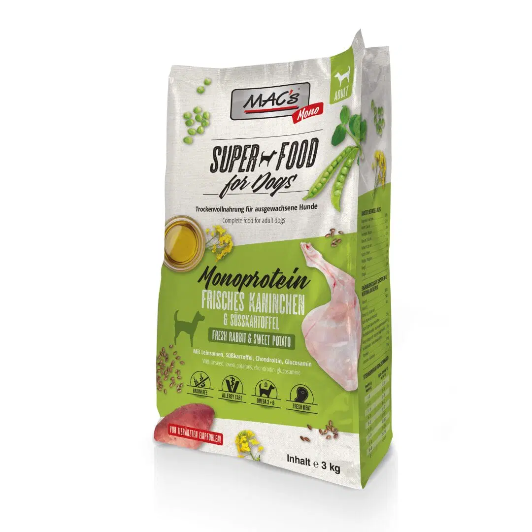 MAC’s Perro Pienso Monoproteína Conejo y Batata es una solución cuidadosamente diseñada para perros adultos con sensibilidades alimentarias. Su composición se centra en la carne de conejo, una fuente de proteína de alta calidad que es menos común en las dietas tradicionales para perros.