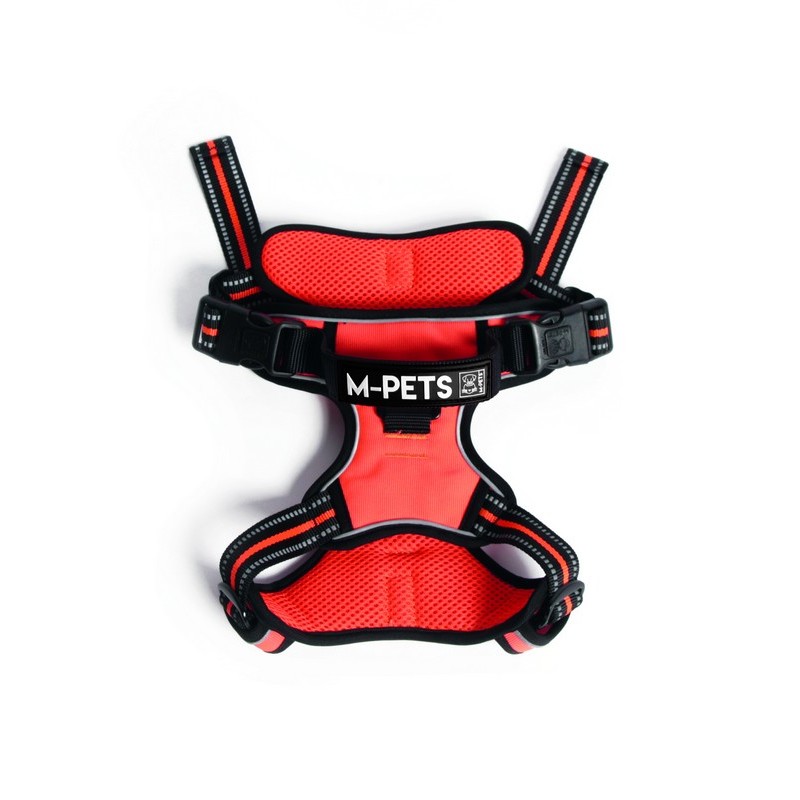 MPets Arnés Hiking Naranja para perros. Arnés ajustable ligero y transpirable de senderismo relleno de poliéster, para perros de todas las razas y disponible en hasta tres tallas. Totalmente ajustable. Relleno con forro Arimesh con una suave malla interior de aire acolchado, dotando al arnés de una mayor comodidad y libertad de movimiento. Producto resistente al agua. Contiene hebillas antitirones bloqueables y el asa superior acolchada. Incluye además bandas reflectantes para distinguirlo por la noche. El cierre lo forman tres clips (dos traseros y uno delantero), lo que facilita la tarea a la hora de ponerlo y quitarlo. Cuentan además con un botón de seguridad que deja al arnés completamente cerrado. Producto muy resistente y duradero.