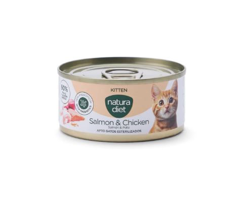 Natura Diet Kitten Salmón Pollo Gatitos. Alimentación complementaria, natural, nutritiva y saludable biológicamente adaptada para el disfrute de gatitos y gatos esterilizados