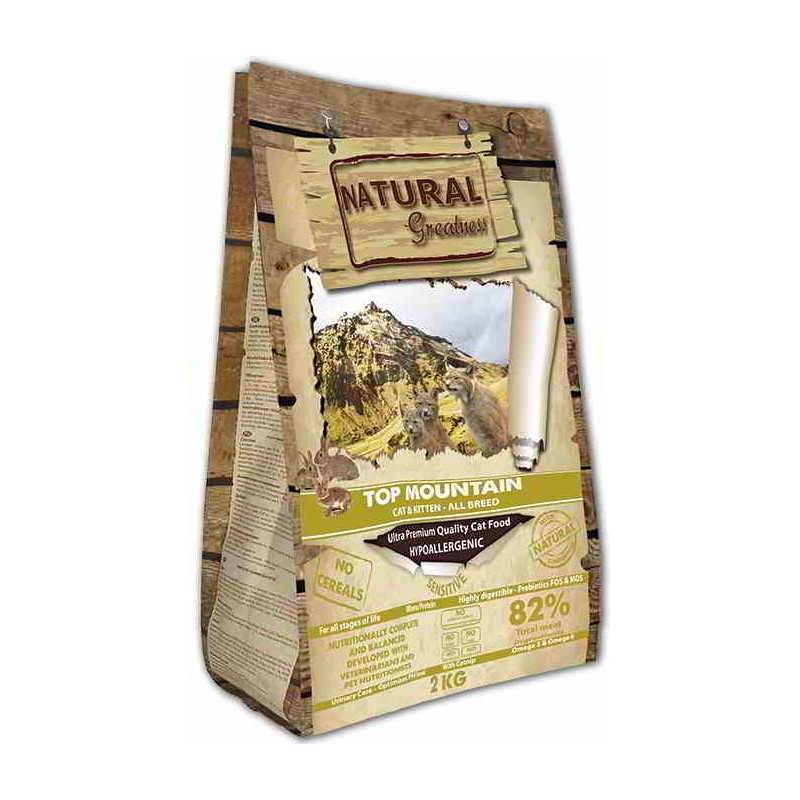 Natural Greatness Top Mountain para gatos de todas las razas y edades. Alimentación completa e hipoalergénica que satisface todas las necesidades nutricionales de los gatos de todas las razas en todas las etapas de la vida. Esta receta hipoalergénica Top Mounatin ha sido formulada sin cereales o granos y con altos porcentajes de carne de conejo. Al ser baja en carbohidratos, proporciona un alto nivel de proteínas adecuado para gatitos, gatas gestantes y gatos adultos. La carne (82% de ingredientes cárnicos) que compone este pienso para gatos es de grado humano, garantizando de esta manera altos niveles de proteínas de calidad que ayudan al desarrollo y mantenimiento de la energía y masa muscular.