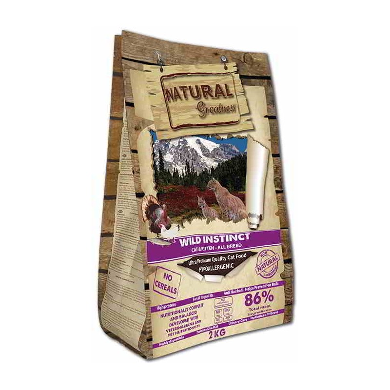 Natural Greatness Wild Instinct para gatos de todas las razas y edades. Alimentación natural completa para gatos de todas las razas y todas las edades. Esta receta, formulada sin cereales o granos, satisface las necesidades nutricionales que requieren todas las razas de gatos en todas las etapas de su vida. Compuesta con un porcentaje muy alto de carne (86%) y bajo en carbohidratos que proporcionan un alto nivel de proteínas adecuado para gatitos, gatas gestantes y gatos adultos. La carne con la que se formula este pienso es de grado humano, garantizando altos niveles de proteínas de calidad para desarrollar y mantener la masa muscular y la energía. Por su composición, esta alimentación natural facilita la expulsión de las bolas de pelo y previene su formación. Cuida el sistema urinario optimizando el nivel de PH y mejora el sistema inmunitario del gato. Además, favorece el tracto digestivo.