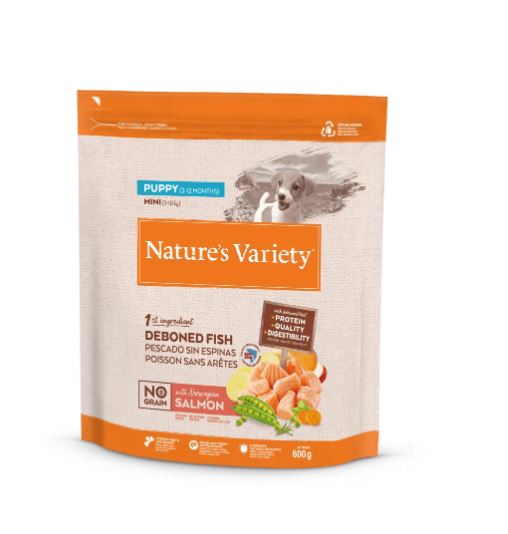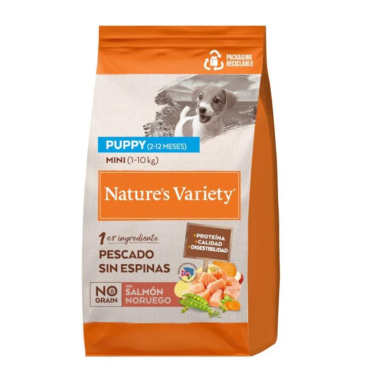 Nature’s Variety No Grain Puppy Mini Salmón. Alimentación completa y equilibrada, sin cereales, para perros cachorros de todos los tamaños (2-12 meses). Supone una alimentación elaborada con ingredientes naturales al vapor. Contiene salmón fresco sin espinas como ingrediente principal, combinado con una selección de frutas y verduras como guisantes, garbanzos y patata que son una fuente alternativa de carbohidratos y que ayudan al perro a tener una salud óptima.