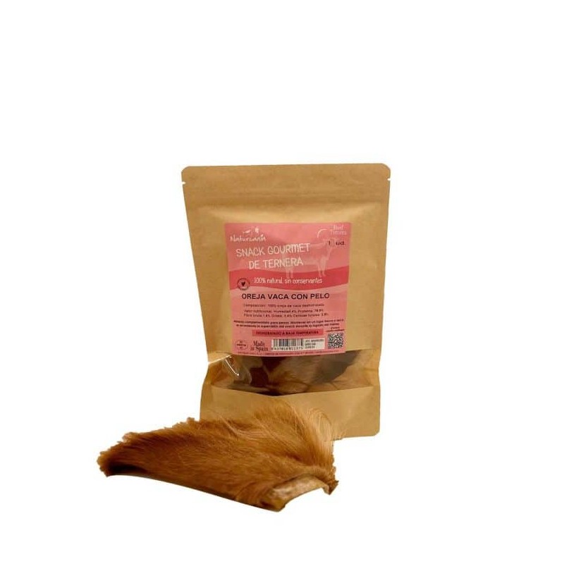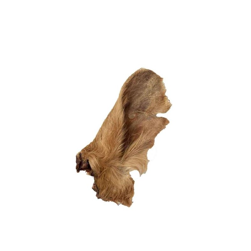 Oreja Vaca Pelo para perros. La oreja de ternera con pelo, se trata de un snack deshidratado con un tamaño adecuado para perros medianos y grandes. Es un aporte de entretenimiento y diversión, el snack 100% natural de vaca es beneficioso para la limpieza dental de manera natural de nuestros peludos.