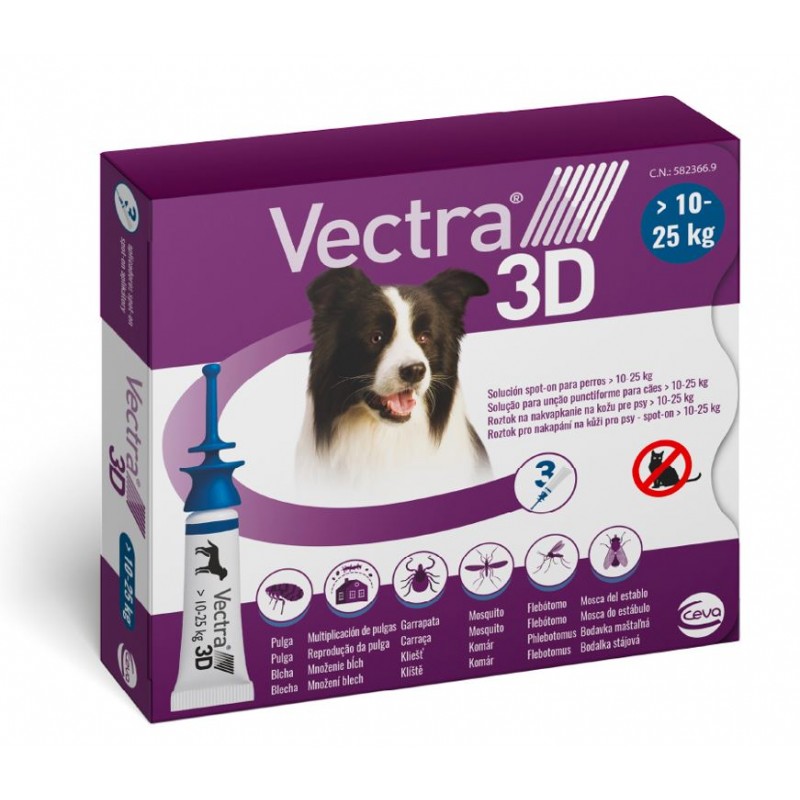 Pipeta Vectra 3D 10-25 Kg para perros. Tratamiento y prevención de la infestación de pulgas, garrapatas, flebótomos, mosquitos y moscas del establo durante un mes. Protege frente al flebótomo transmisor de la Leishmaniosis y el mosquito transmisor del gusano del corazón. Repele y mata las pulgas y garrapatas.