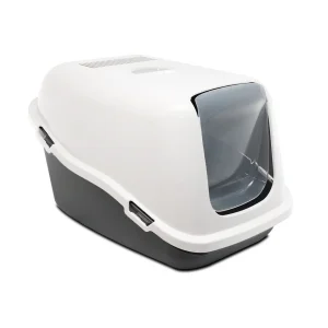 El aseo para gatos de la casa Nestor es fácil de limpiar. El frente especialmente desarrollado se abre de par en par, lo que permite quitar la arena para gatos sucia con cuidado y rapidez sin quitar la parte superior. La bandeja del Nestor tiene un respaldo elevado que evita fugas. Con tirador incorporado, puerta batiente de plástico y filtro de carbón.