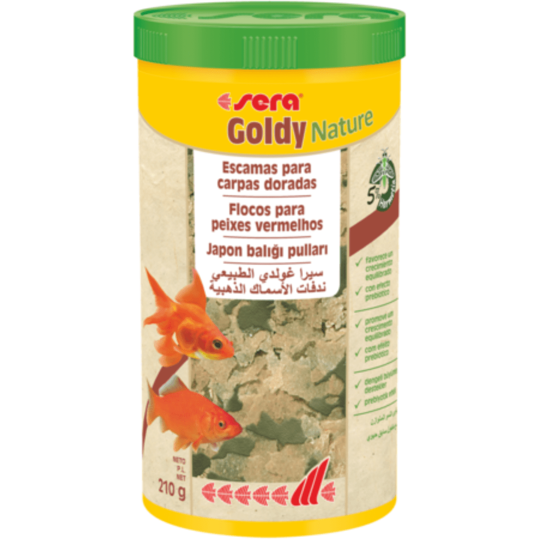 Sera Goldy Nature es el alimento principal para carpas doradas pequeñas y sus variedades de cría como p. ej. shubunkin, cola de velo o sarasa y otros peces de agua fría, sin colorantes ni conservantes.