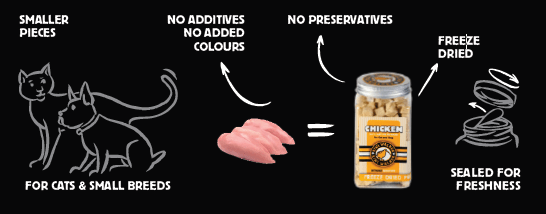 El hígado de pollo es liofilizado, es decir se congela temperaturas muy muy bajas y de manera rápida, evitando así la formación de cristales de hielo de gran tamaño. Después se hace el vacío para que se evapore el agua sin necesidad de que ésta pase por estado líquido. Así se mantienen intactas sus propiedades nutricionales, su olor y su sabor.