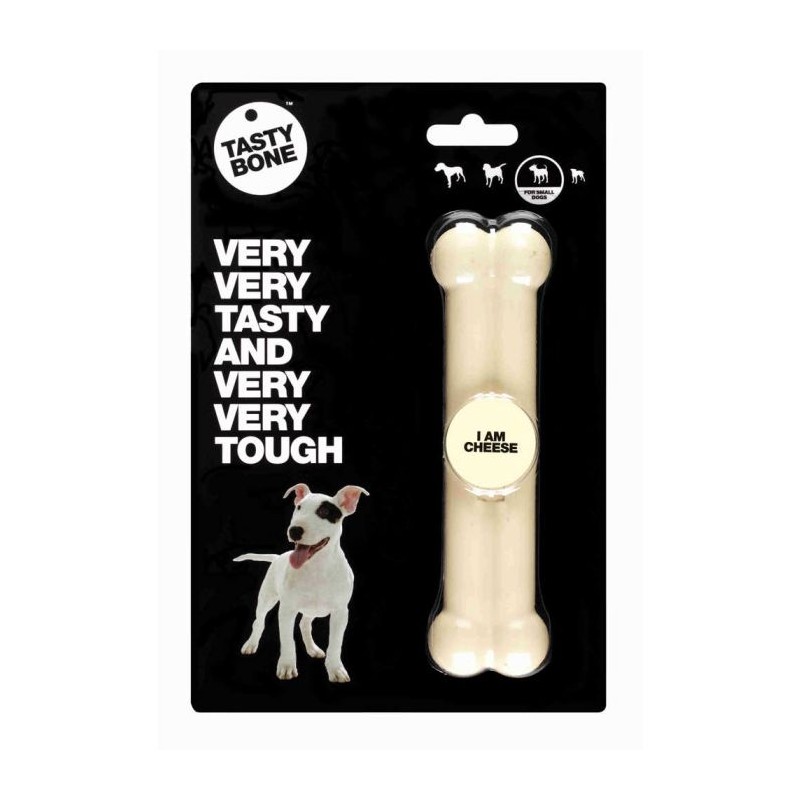 Tasty Bone Toy para perros pequeños. El mordedor Tasty Bone Small es un juguete con forma de hueso y de última generación recomendado para perros de tamaño mini / toy. Este juguete mordedor está aromatizado con un intenso, duradero y delicioso sabor a bacon, ternera, queso, pollo, chocolate o cordero (a elegir el que más le guste al perro). Producto de alta calidad que además de mantener a la mascota entretenida y lejos de morder muebles y otros objetos, ayuda a cuidar la salud bucal del perro: Ayuda a fortalecer la musculatura de la mandíbula, previene la acumulación de sarro e infecciones de encías o mal aliento. Aroma duradero durante toda la vida útil del producto
