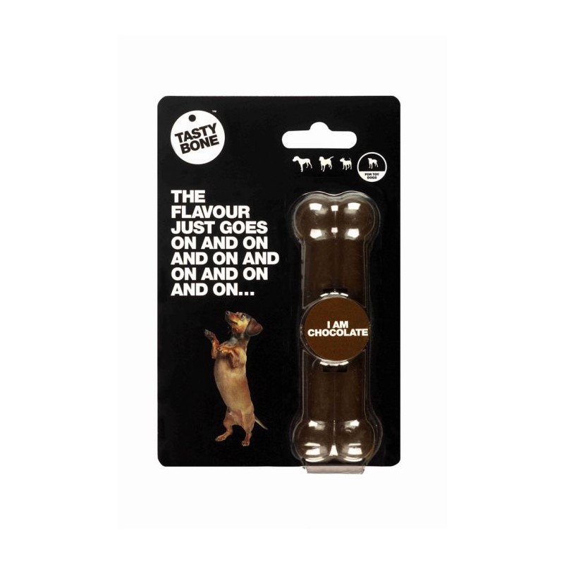 Tasty Bone Toy para perros mini. El mordedor Tasty Bone Toy es un juguete con forma de hueso y de última generación recomendado para perros de tamaño mini / toy. Este juguete mordedor está aromatizado con un intenso, duradero y delicioso sabor a bacon, ternera, queso, pollo, chocolate o cordero (a elegir el que más le guste al perro). Producto de alta calidad que además de mantener a la mascota entretenida y lejos de morder muebles y otros objetos, ayuda a cuidar la salud bucal del perro: Ayuda a fortalecer la musculatura de la mandíbula, previene la acumulación de sarro e infecciones de encías o mal aliento. Aroma duradero durante toda la vida útil del producto