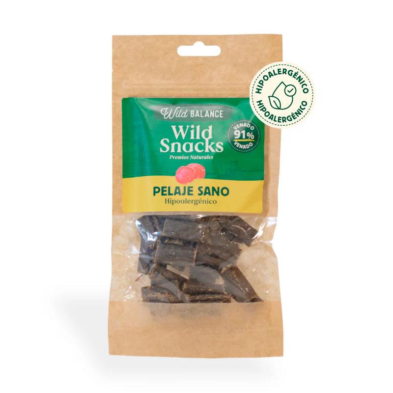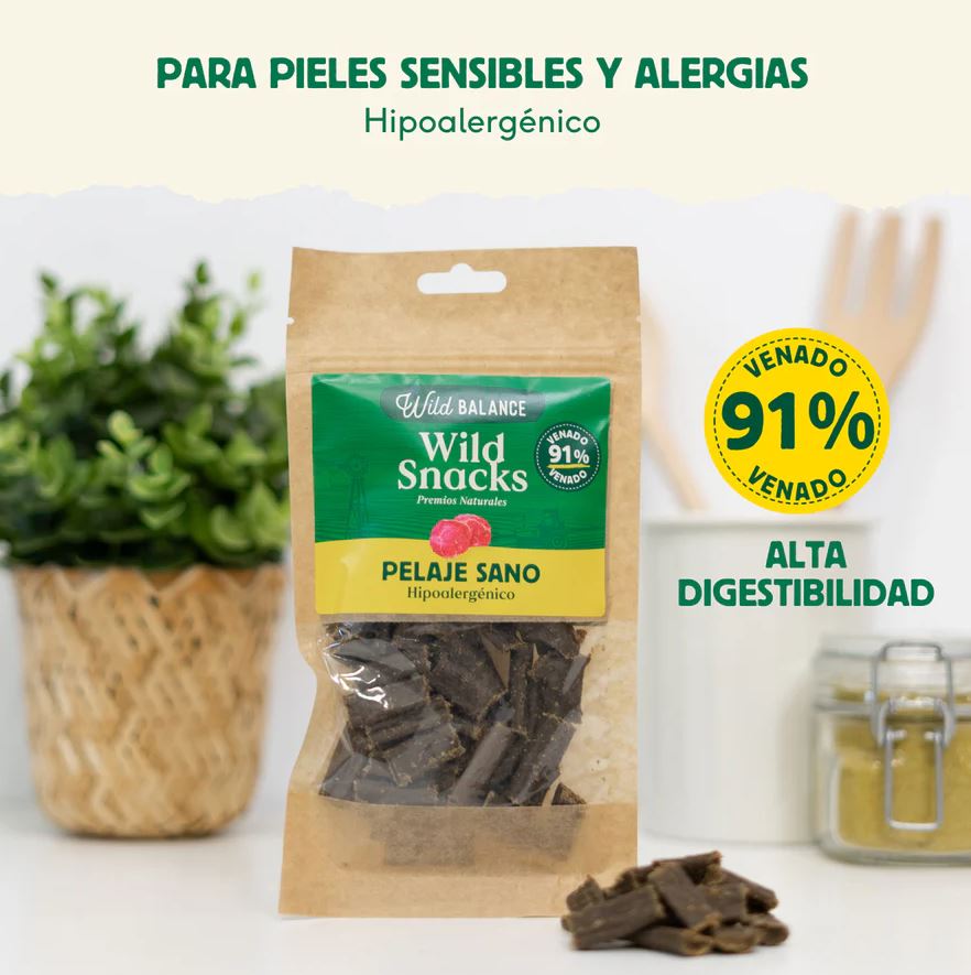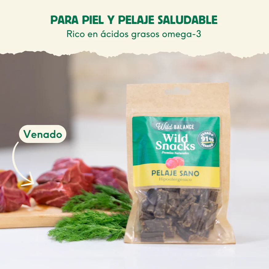 Wild Balance Snack Pelaje Sano Venado perros. Snacks saludables para perros están elaborados con 91% de venado, una fuente de proteína altamente digestible que favorece la salud dérmica y ayuda a prevenir alergias alimentarias.
